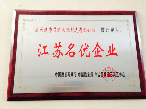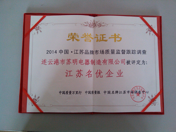 在2014年3.15到來(lái)之際,連云港市蘇明電器制造有限公司被中國(guó).江蘇品牌市場(chǎng)質(zhì)量監(jiān)督跟蹤調(diào)查中心評(píng)為 “江蘇名優(yōu)企業(yè)”。